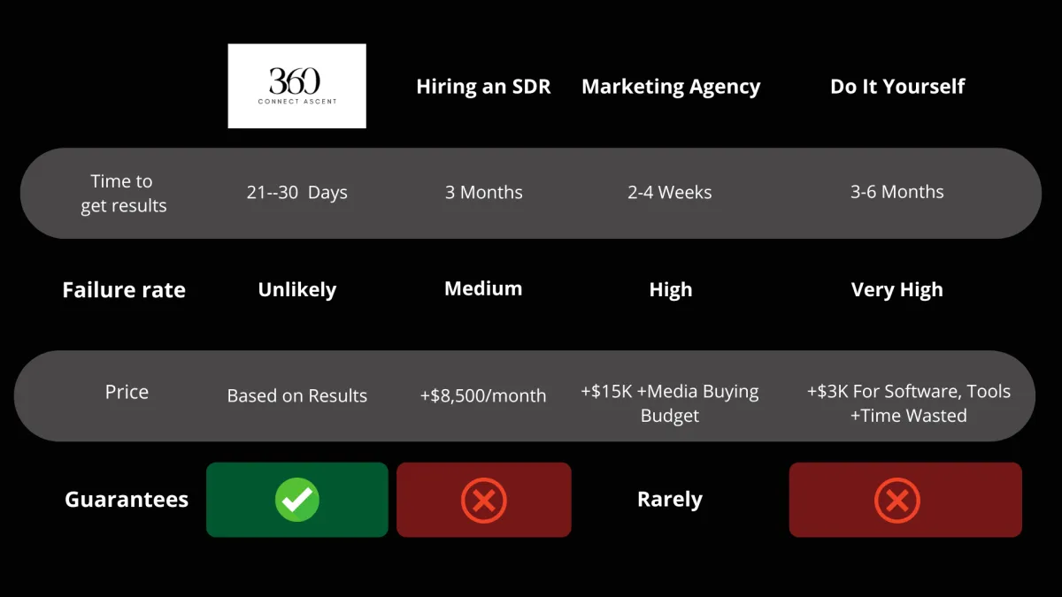 Faster Revenue Generation: Connecting you with only the most relevant ICP, 360ConnectAscent shortens the sales cycle, helping you close deals quicker and get cash flowing faster — which accelerate Revenue Growth..
